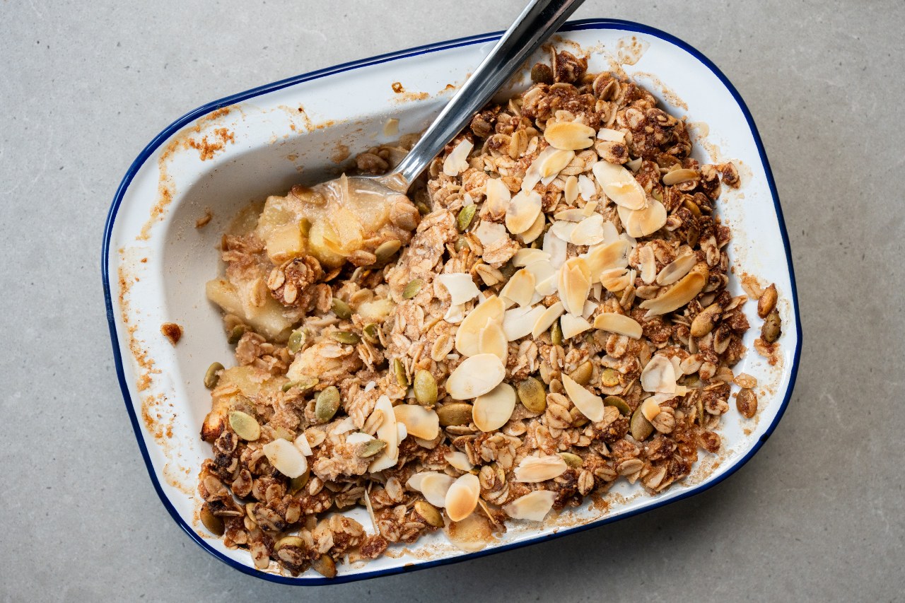 - Haal voorzichtig de ovenschaal uit de oven. Verdeel de crumble over het geheel en druk deze plat met de spatel.