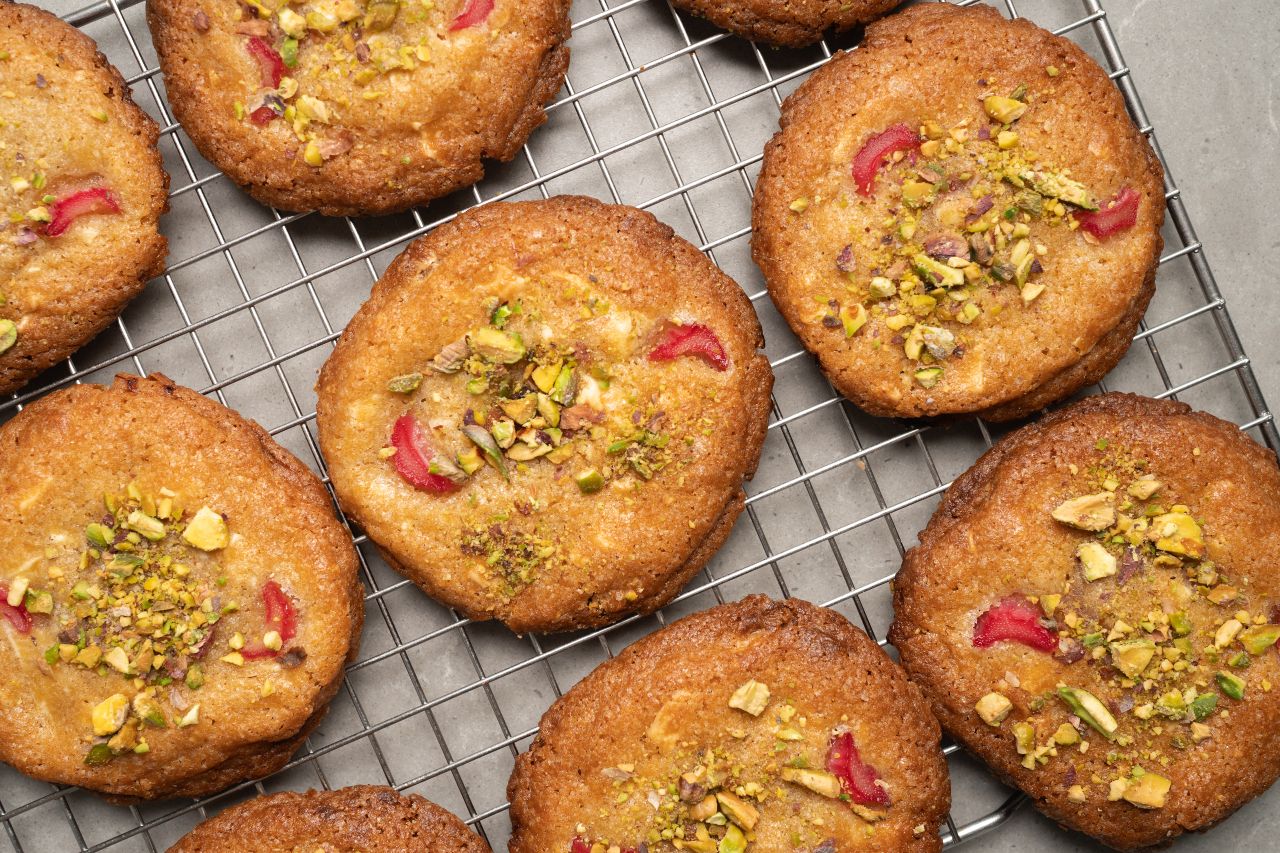 Wie houdt er niet van chocolate chip koeken? Dit is een heerlijke zonnige variant met witte chocolade en rabarber jam. Geen rabarber(jam) in huis? Vervang dan voor frambozen. Ze zijn romig, zoet, zuur en de gezouten pistache garnering maakt het helemaal af. Ideaal voor de paastafel dus om samen van te genieten.